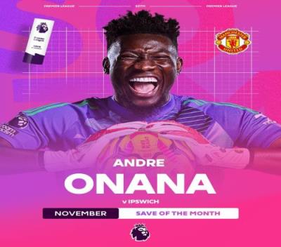 在英超第12轮,曼联1-1战平伊普斯维奇,本场比赛奥纳纳贡献多次扑救,其中第39分钟扑出德拉普近距离射门尤为精彩,这次扑救也当选英超11月最佳。