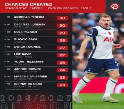 体育资讯11月12日报道宣称 Squawka统计了球员本赛季在英超创造机会的次数,并列出榜单,佩雷拉、库卢塞夫斯基创造30次机会居首,帕尔默29次排名第三位。