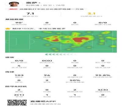 数据很稳球迷很慌宽萨2解围2抢断6对抗4成功+传球成功率96%