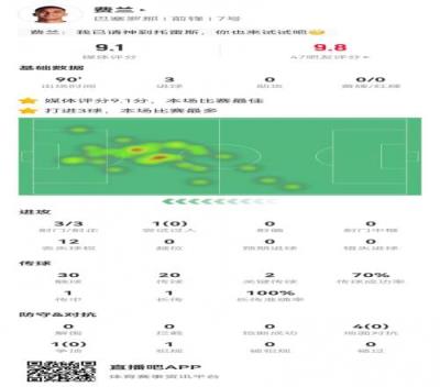 请叫托雷斯!费兰本场3射3正3球2关键传球+5对抗0成功9.1分最高