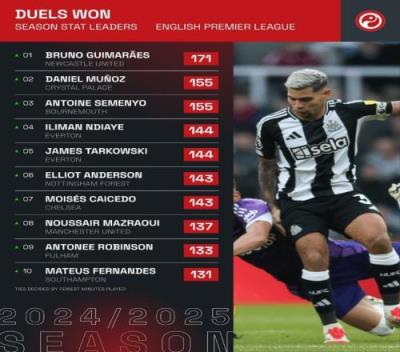 体育资讯2月5日报道宣称 squawka统计了本赛季英超成功对抗情况,吉马良斯独自居首。