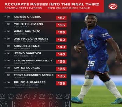 英超传球到进攻三区榜:凯塞多压范迪克居首,曼城3将在列