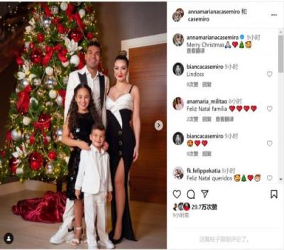 卡塞米罗与玛丽安娜晒出一家人在圣诞树前的合照,玛丽安娜写道:“圣诞快乐。”