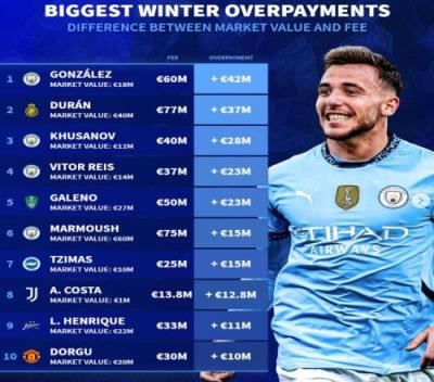 体育资讯2月5日报道宣称 五大联赛冬窗已经结束,《转会市场》也列出了冬窗溢价引援榜,前六中曼城占据4席。