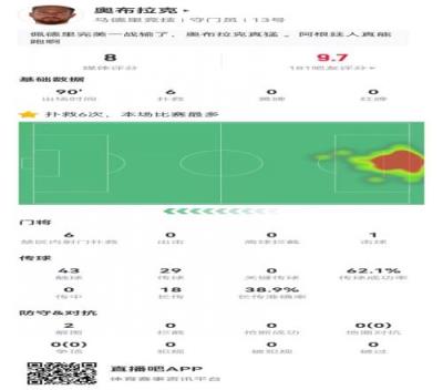 体育资讯12月22日报道宣称 巴萨在本轮西甲焦点战1-2被马竞逆转绝杀,奥布拉克本场数据如下: