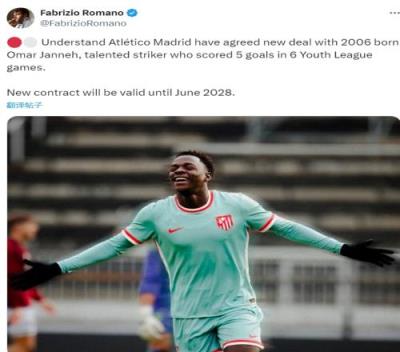 体育资讯12月12日报道宣称 据名记罗马诺报道,马竞已经和18岁小将詹尼达成协议,双方将续约至2028年6月。