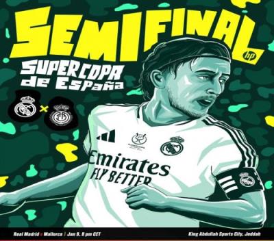 皇马官方社媒发布了为此役制作的海报,莫德里奇的漫画形象出镜,上面还有两队的队徽,以及“西班牙超级杯半决赛”字样。