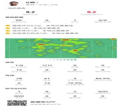 B费本场1助攻+3关键传球14长传10成功5对抗5成功8.2分全场最高