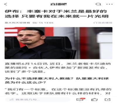体育资讯12月30日报道宣称 今年6月14日,米兰老板卡尔迪纳莱的顾问+合伙人伊布在采访中解释了选择丰塞卡出任主帅的决定。