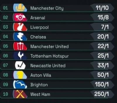 相关机构也列出了新赛季英超夺冠赔率榜: