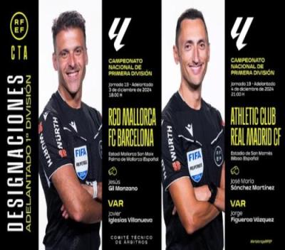 体育资讯12月2日报道宣称 本周中,西甲第19轮将先进行两场比赛的较量。西班牙足协官方公布了本场比赛的裁判安排,曼萨诺执法巴萨客战马洛卡,桑切斯-马丁内斯主裁皇马客战毕尔巴鄂竞技。