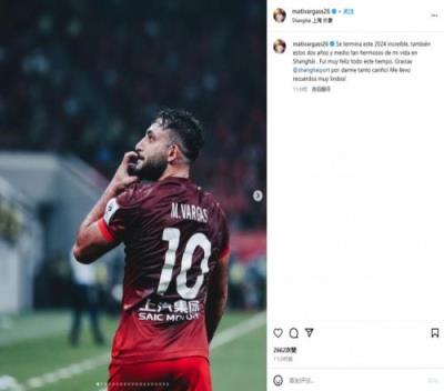巴尔加斯社媒告别:上海两年半美好生活结束了,谢谢海港给我的爱