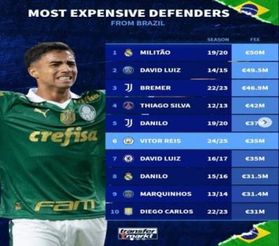 体育资讯1月21日报道宣称 曼城官方宣布签下雷斯,转会费3500万欧。德转也盘点了巴西后卫历史转会费最高榜单,具体如下: