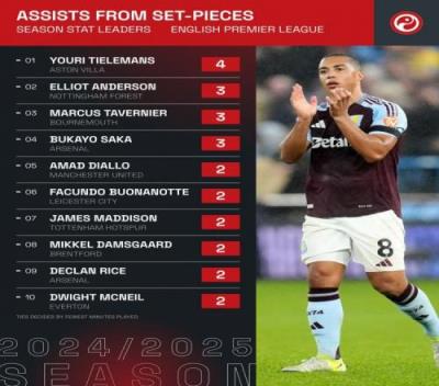本赛季英超定位球助攻榜:蒂莱曼斯4助居首,萨卡3助并列次席