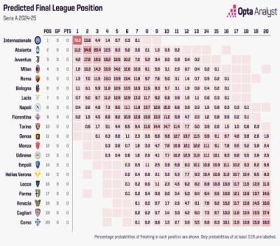 体育资讯8月15日报道宣 数据机构Opta研究中心公布了超级计算机对新赛季的意甲预测。在模拟了超过10000次之后,得出了以下新赛季意甲的预测结果,包括包括各队在各个排名的概率。