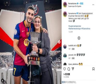 费兰-托雷斯晒出合影,并配文写道:“我们是超级杯冠军!2025年的第一座奖杯!