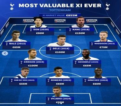 德转列热刺队史身价最高阵:凯恩领衔,孙兴慜、贝尔在列