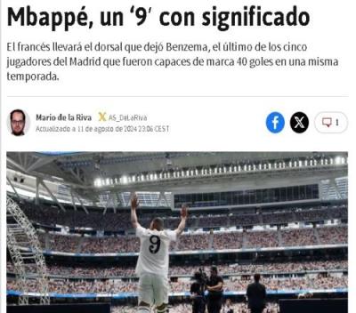阿斯:穿皇马9号的姆巴佩将承担进球重任皇马历史仅5人赛季40球+