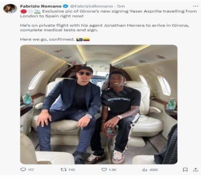 阿斯普里拉和他的经纪人乔纳森-埃雷拉正在搭乘私人飞机前往赫罗纳,以完成体检和签约工作。
