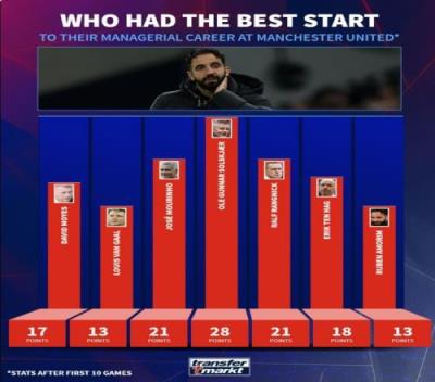 体育资讯12月31日报道宣称 曼联新帅阿莫林在接受球队初期战绩未能达到预期,德转也盘点了曼联近7位主帅在前10场比赛过后的积分情况,其中阿莫林与范加尔均为13分最低,以下为具体情况: