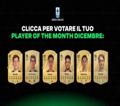 体育资讯1月9日报道宣称 意甲官方公布了12月联赛最佳球员的候选名单,巴雷拉、赖因德斯、迪巴拉和CDK等人获得提名。