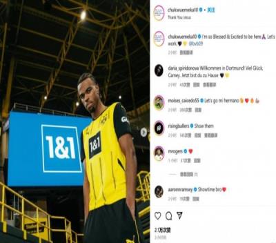 楚克乌梅卡通过社媒晒出自己身穿多特球衣现身威斯特法伦球场的照片,并表示:“能够来到这里,我感到非常荣幸与激动。让我们开始努力吧!@多特蒙德俱乐部。”