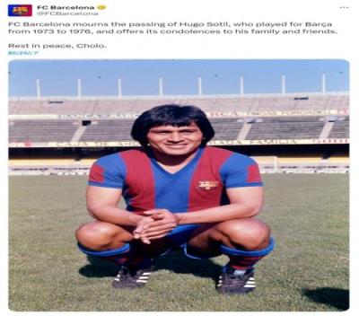 巴萨官方社媒晒出索蒂尔效力球队时期的照片,并写道:“巴塞罗那足球俱乐部对1973年至1976年效力于巴萨的雨果-索蒂尔的逝世表示哀悼,并向他的家人和朋友致以慰问。安息吧,乔洛(索蒂尔)。”