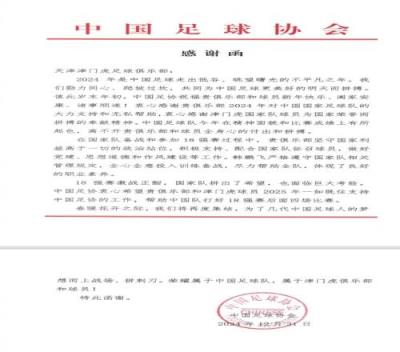 12月30日、31日,津门虎俱乐部收到来自中国足协的两封感谢信