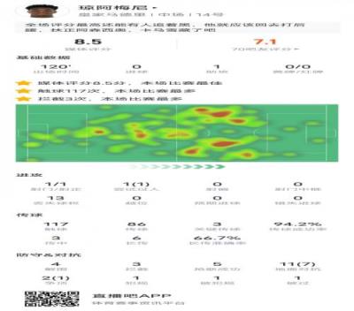 琼阿梅尼本场数据:1助攻4解围3拦截5抢断,评分8.5全场最高