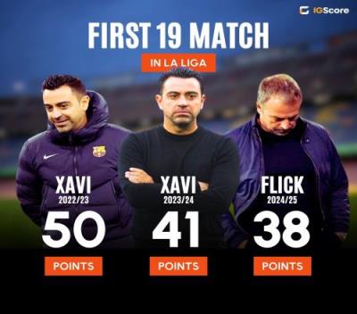 据媒体统计,弗里克本赛季带领巴萨西甲前19场比赛拿到38分,低于此前哈维带队的两个赛季。