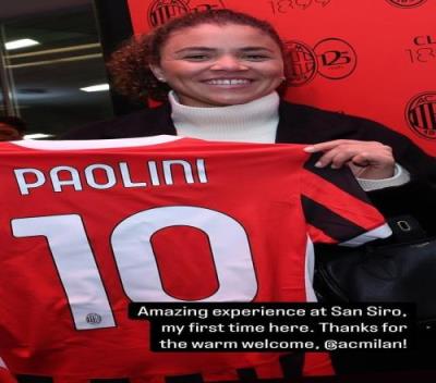 与此同时,保利尼还获赠一件印有她名字的米兰10号球衣,她在社媒写道:“在圣西罗的非凡体验,这是我第一次来这里,谢谢米兰的热烈欢迎。”