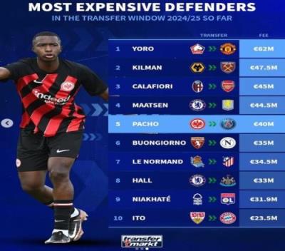 体育资讯8月10日报道宣 巴黎已经官宣签下法兰克福后卫帕乔,德转数据统计显示这位厄瓜多尔中卫在今夏的后卫转会费榜位列第5。