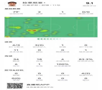 拉菲尼亚本场数据:2射1传2过人成功+4关键传球,评分9.1