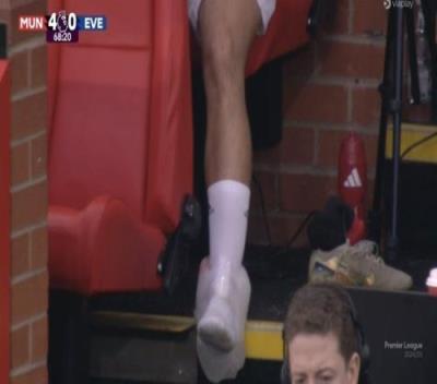 曼联昨晚4-0大胜埃弗顿,B费下场后被拍到在场边给脚踝做冰敷。