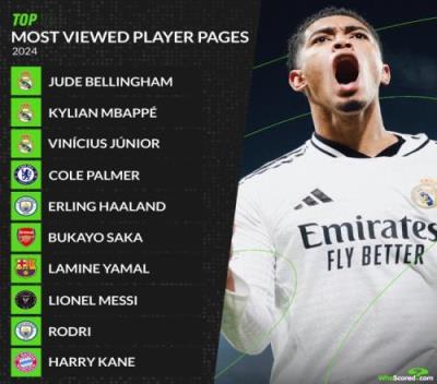 whoscored2024球员页面访问榜:皇马占前三,五大联赛外仅梅西