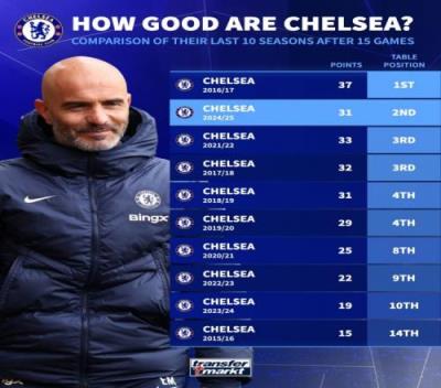 目前,英超十五轮比赛战罢,切尔西在多赛一场的情况下落后榜首利物浦4分,排在英超积分榜的第二位。历史最佳战绩是在2016-17赛季,当时切尔西在十五轮比赛之后取得了37分。
