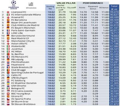 体育资讯01月30日报道宣称 专业足球数据媒体footballmeetdata计算了本赛季第一阶段的欧冠奖金,其中利物浦近1亿欧居首,国米第2,枪手第3巴萨第4。