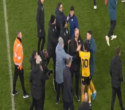 根据视频显示,打入一球的狼队前锋库尼亚(10号)肘击一位伊普斯维奇队工作人员(据太阳报报道为伊普斯维奇安保人员),随后更是粗鲁地从对方脸上直接扒下眼镜。