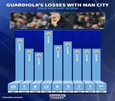 德国转会市场统计了瓜帅执教曼城以来各赛事的输球场次,并作出对比。曼城本赛季至今已经输掉7场比赛,距离输球最多的19-20赛季差5场。