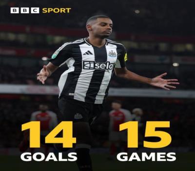 体育资讯01月08日报道宣称 联赛杯半决赛首回合,纽卡客场2-0击败阿森纳,状态火热的伊萨克最近15场比赛攻入14球。