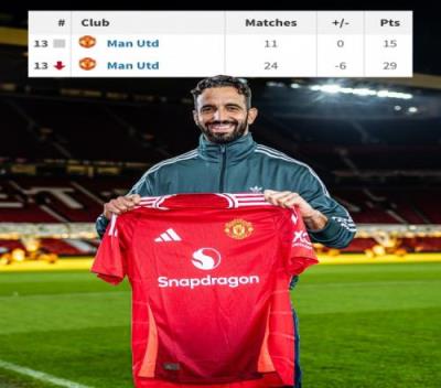 本赛季至今,阿莫林率队踢了13轮英超比赛后,曼联24轮拿到29分,净胜球-6,排名英超第13位。
