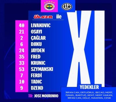 费内巴切首发:40-利瓦科维奇、21-奥萨伊、2-瑟云聚、6-迪库、24-奥斯特沃尔德、35-弗雷德、33-克鲁尼奇、53-希曼斯基、7-费尔迪、10-塔迪奇、9-哲科