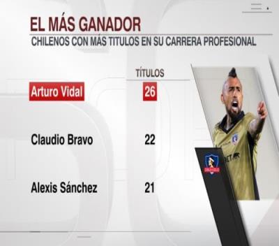 比达尔斩获职业生涯第26冠智利球员最多,布拉沃22冠次席