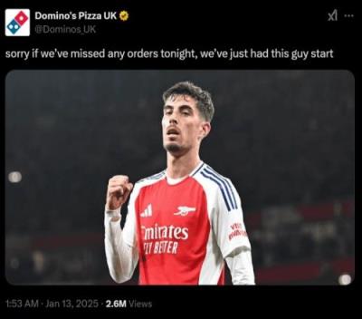 体育资讯1月13日报道宣称 足总杯第三轮焦点大战,阿森纳点球大战不敌十人作战的曼联。本场比赛,哈弗茨发挥不佳,罚丢点球,且错失绝佳机会。知名披萨连锁品牌达美乐也吐槽了他的表现。