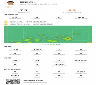 体育资讯1月17日报道宣称 国王杯1/8决赛,皇马5-2加时战胜塞尔塔。此役居勒尔替补登场50分钟,球员全场重点数据如下↓