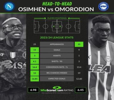 20岁奥莫罗迪翁上赛季35场联赛9球1助,25岁奥斯梅恩25场15球3助