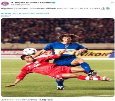 拜仁官方社媒晒出当时的比赛照片,并配文:“我们上次与博卡青年交手的照片。”