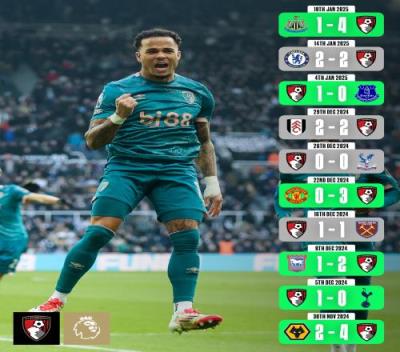 体育资讯01月19日报道宣称 本轮英超,伯恩茅斯4-1大胜纽卡,升至英超第6位。