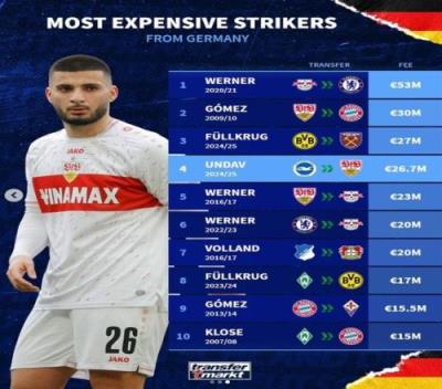 体育资讯8月10日报道宣 斯图加特官宣签下布莱顿中锋翁达夫,《转会市场》也统计了德国中锋历史转会费榜单,维尔纳三度上榜。