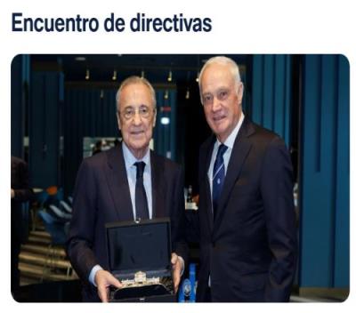 体育资讯12月11日报道宣称 欧冠联赛阶段第6轮,皇马和亚特兰大交手。本场比赛之前,皇马主席弗洛伦蒂诺和亚特兰大主席佩尔卡西进行了会面并互赠礼物,两家俱乐部多名高层也有出席。